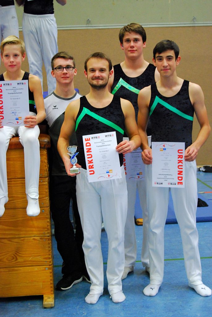 Wie auch im letzten Jahr unterstützte Marc Ruiz Moreno vom TV Utfort-Eick mit seinem Zweitstartrecht die Mannschaft (WK 16+) des TV Voerde und sie belegten den 3. Platz. Er machte sich als „Leihgabe“ für den TV Voerde bezahlt, da Finn Krüger kurzfristig verletzungsbedingt ausfiel. Das hieß nun für die restlichen drei Turner, dass es keine Streichwertung mehr gab und somit war der Druck doch etwas größer. Alle drei Trampolinturner bewiesen im Vorkampf Nervenstärke und schafften es ohne „Patzer“ mit sauber geturnten Übungen als Dritte ins Finale einzuziehen. Und auch im Finale konnten sie ihren 3. Platz mit mehr als 40 Punkten Vorsprung, sicher verteidigen.