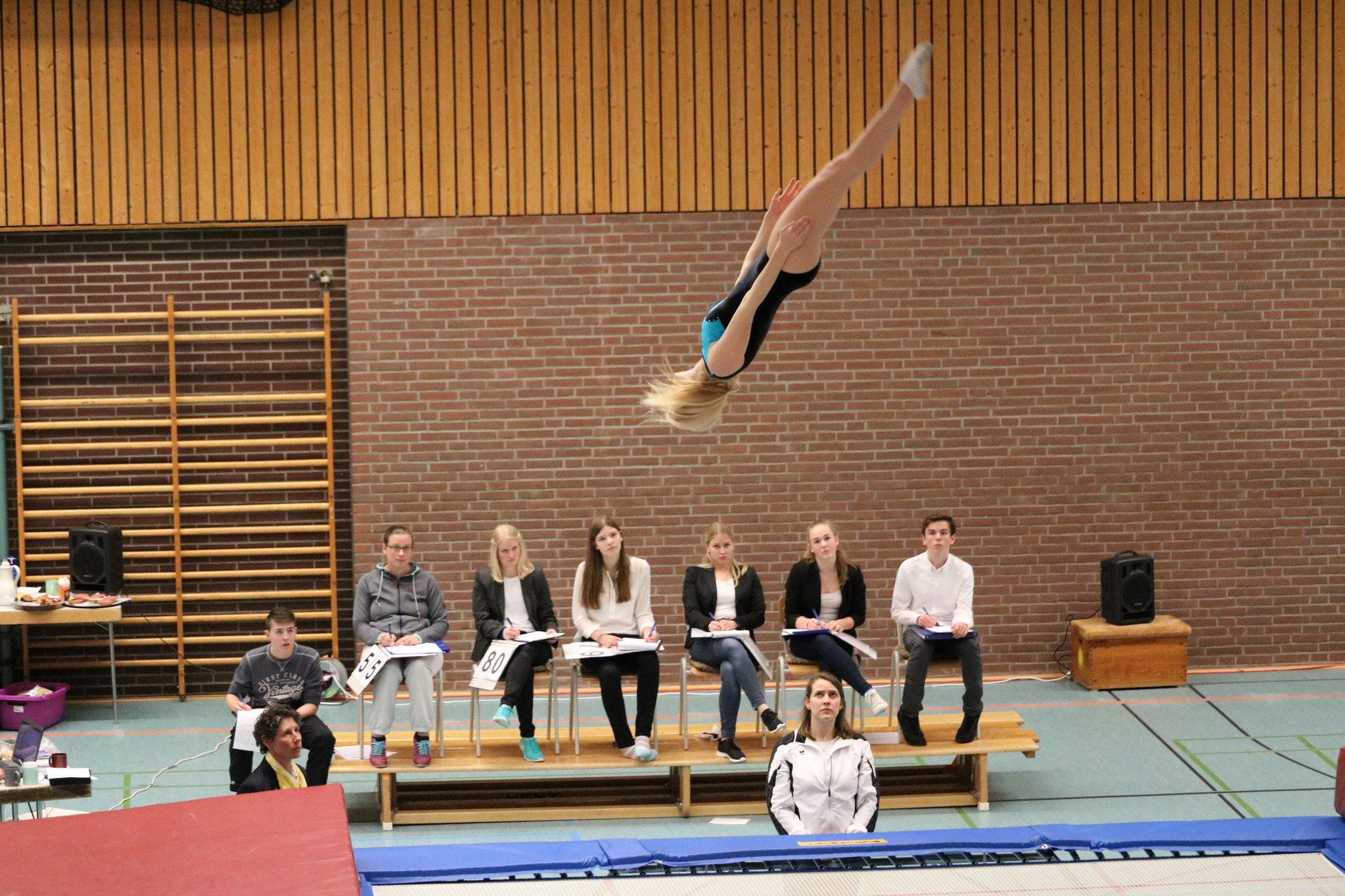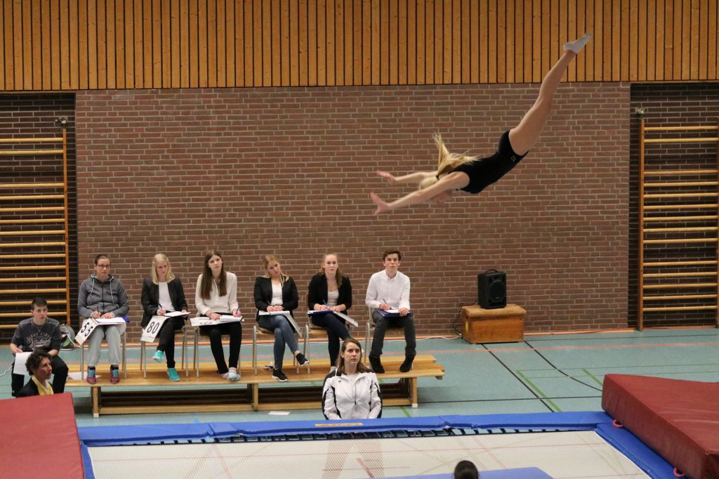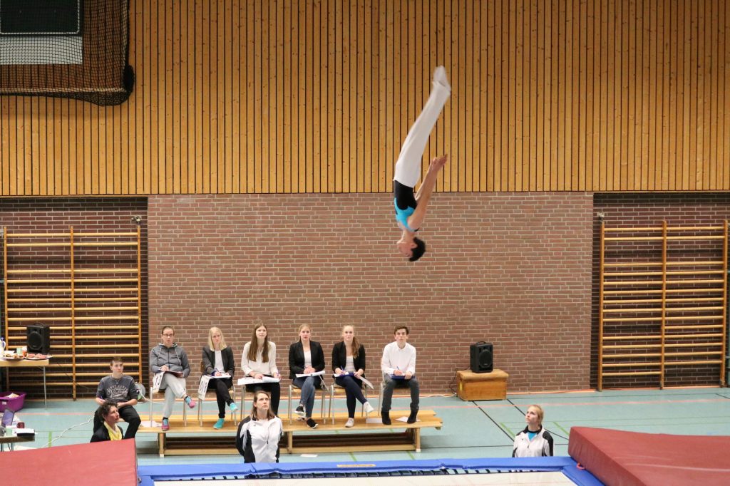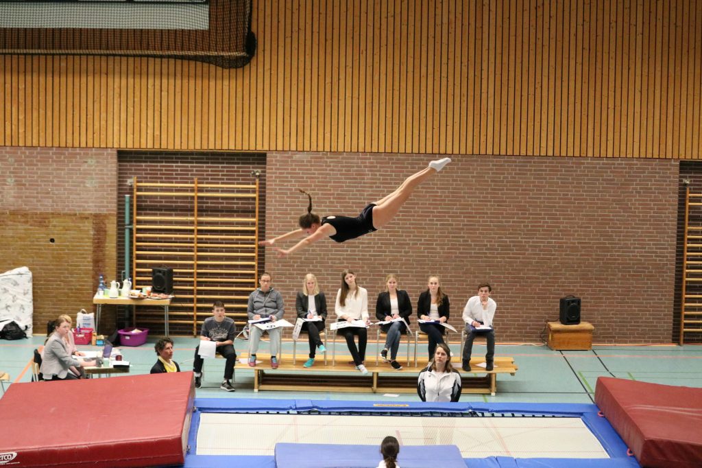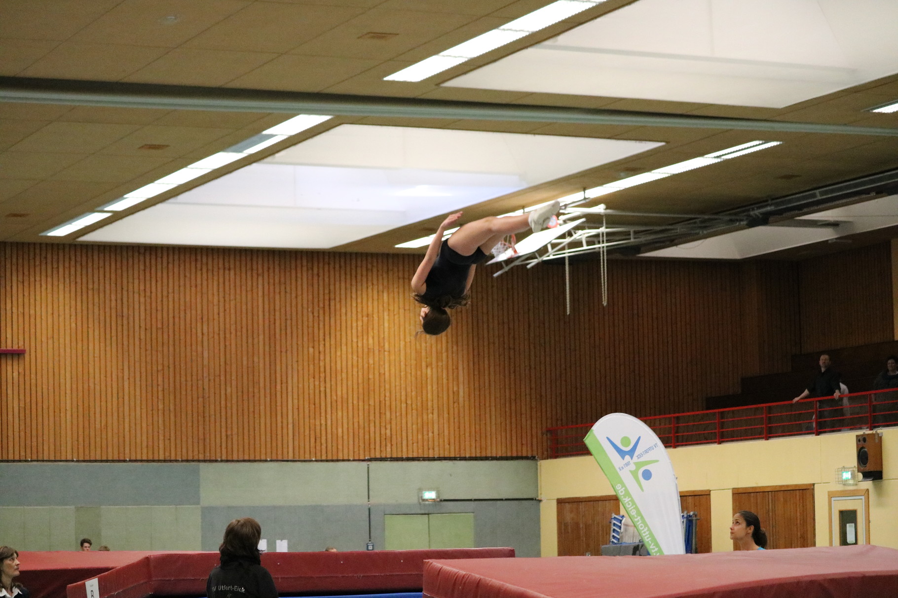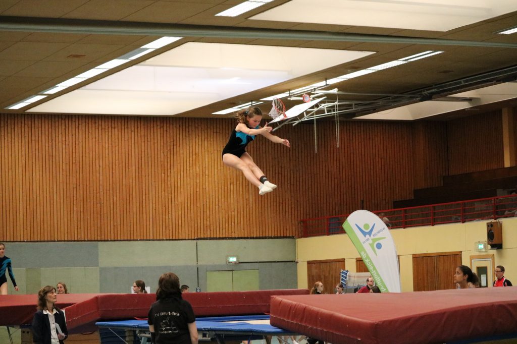Mittags startete dann die Rheinlandliga und es konnte Trampolinturnen auf hohem Niveau bestaunt werden. Hier ging für den TV Unterbach Matthias Moßner (Jg. 90), der schon an internationalen Wettkämpfen teilgenommen hat, und Olegs Snikers (Jg. 01), der erst vor kurzem in der TV Sendung „Klein gegen Groß“ mit seinen Trampolinfertigkeiten zu sehen war, an den Start. In diesem Wettbewerb lief es gut für den TV Utfort-Eick, denn die Mannschaft (Dinah Lindemann, Marc Ruiz Moreno, Celine Jacobsen, Alina Fünderich, Jill Jacobsen und Angelina Murmann) konnte sich aufgrund konstanter Übungen von Jill Jacobsen und Angelina Murmann, die einen Doppelsalto in ihre Kür eingebaut hat, um einen Platz verbessern. So wurde es zum Schluss für den TV Utfort-Eick doch noch der 4. Platz, hinter dem TV Unterbach, TUS Brauweiler und dem TV Voerde.