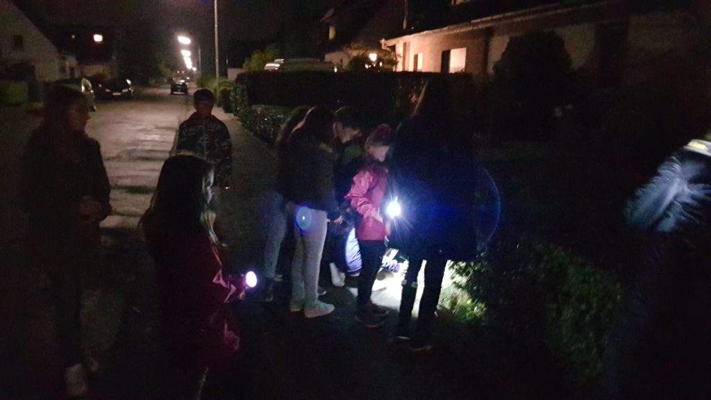 Nachdem das Wetter zunächst noch schlecht war, wurden erst einmal ein paar Spiele, auch zum besseren Kennenlernen der Kinder untereinander, in der Turnhalle gespielt. Gegen 18:00 Uhr waren dann alle recht hungrig und es wurde im MZR gemeinsam zu Abend gegessen. Zum Glück hörte es während des Essens dann auf zu regnen und so konnten die kleinen Nachtschwärmer doch noch nach Einbruch der Dunkelheit mit Taschenlampen bewaffnet zu einer Nachtwanderung zum Geleucht aufbrechen. Auf dem Weg zum Geleucht wurde auf der Fontanestraße eine Kröte gerettet, die auf der Fahrbahn saß. Etwas erschöpft auf dem Geleucht angekommen, wurden alle Teilnehmer mit einer tollen Aussicht auf Duisburg und Voerde entlohnt. Auch ein Feuerwerk am Horizont (natürlich eigens für die Nachtwanderung organisiert 😉 ) beeindruckte die Kids. Nach dem Rückweg waren die Kinder nach einem kleinen Snack dann aber doch wieder relativ fit und so gab es auch noch einen Kissenschlacht. Nach dem Zähneputzen ging es dann ins Bett. Natürlich wurde hier und da noch getuschelt und so schliefen die Kinder am nächsten Tag zu Lars‘ und Susannes Verwunderung doch verhältnismäßig lange. Nach dem Frühstück wurde dann zusammengepackt und die Kinder abgeholt. Alles in allem eine sehr nette und gelungene Vereinsveranstaltung.